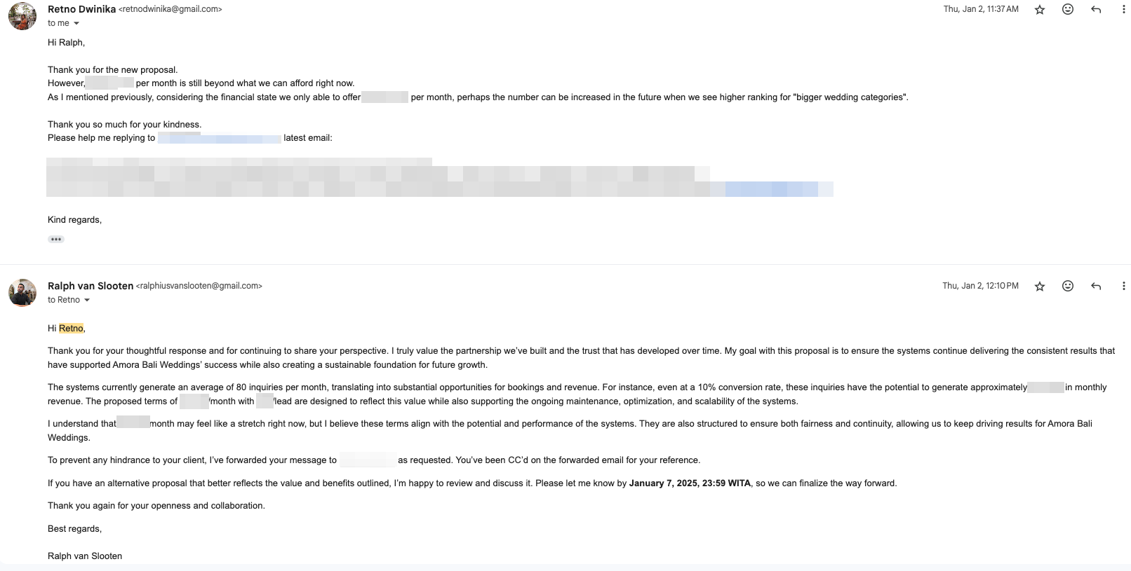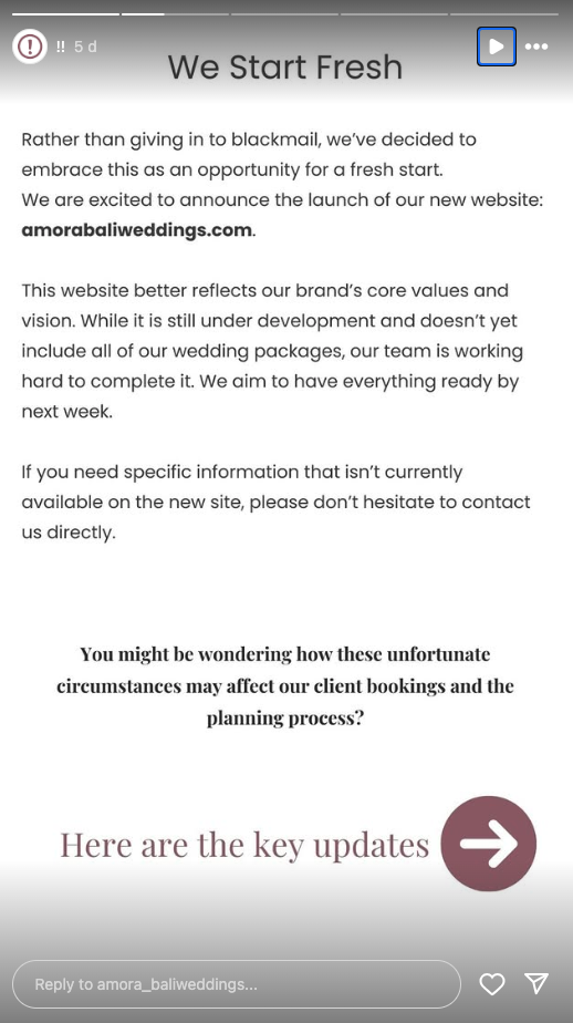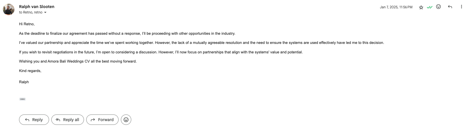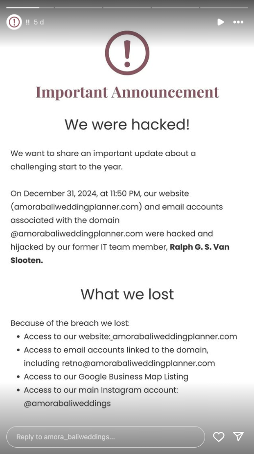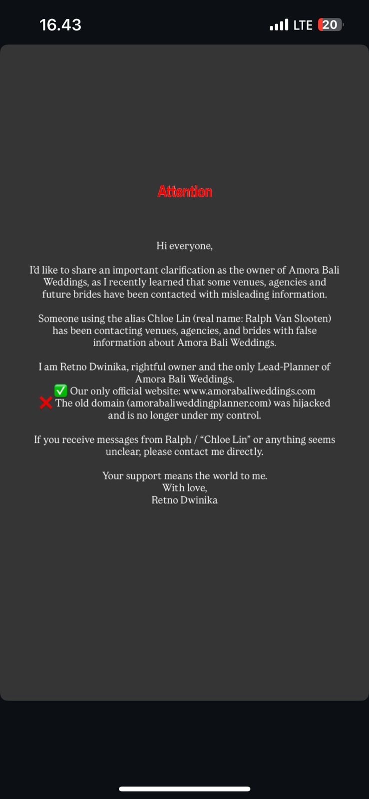"Our website (amorabaliweddingplanner.com) and email accounts associated with the domain amorabaliweddingplanner.com were hacked and hijacked by our former IT team member, Ralph G.S. van Slooten"