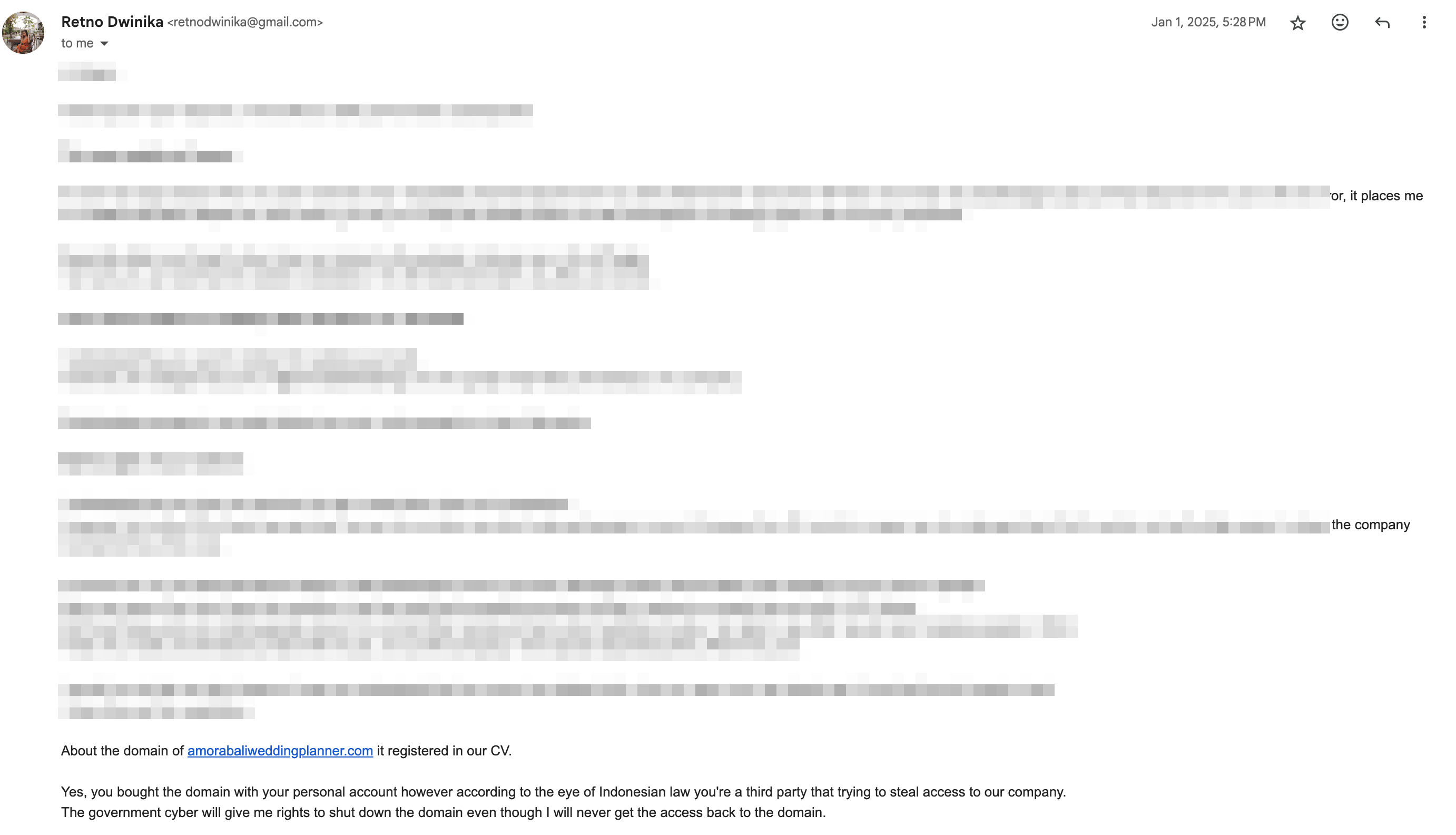 View Screenshot →"About the domain of amorabaliweddingplanner.com it registered in our CV. Yes, you bought the domain with your personal account however according to the eye of Indonesian law you're a third party that trying to steal access to our company."